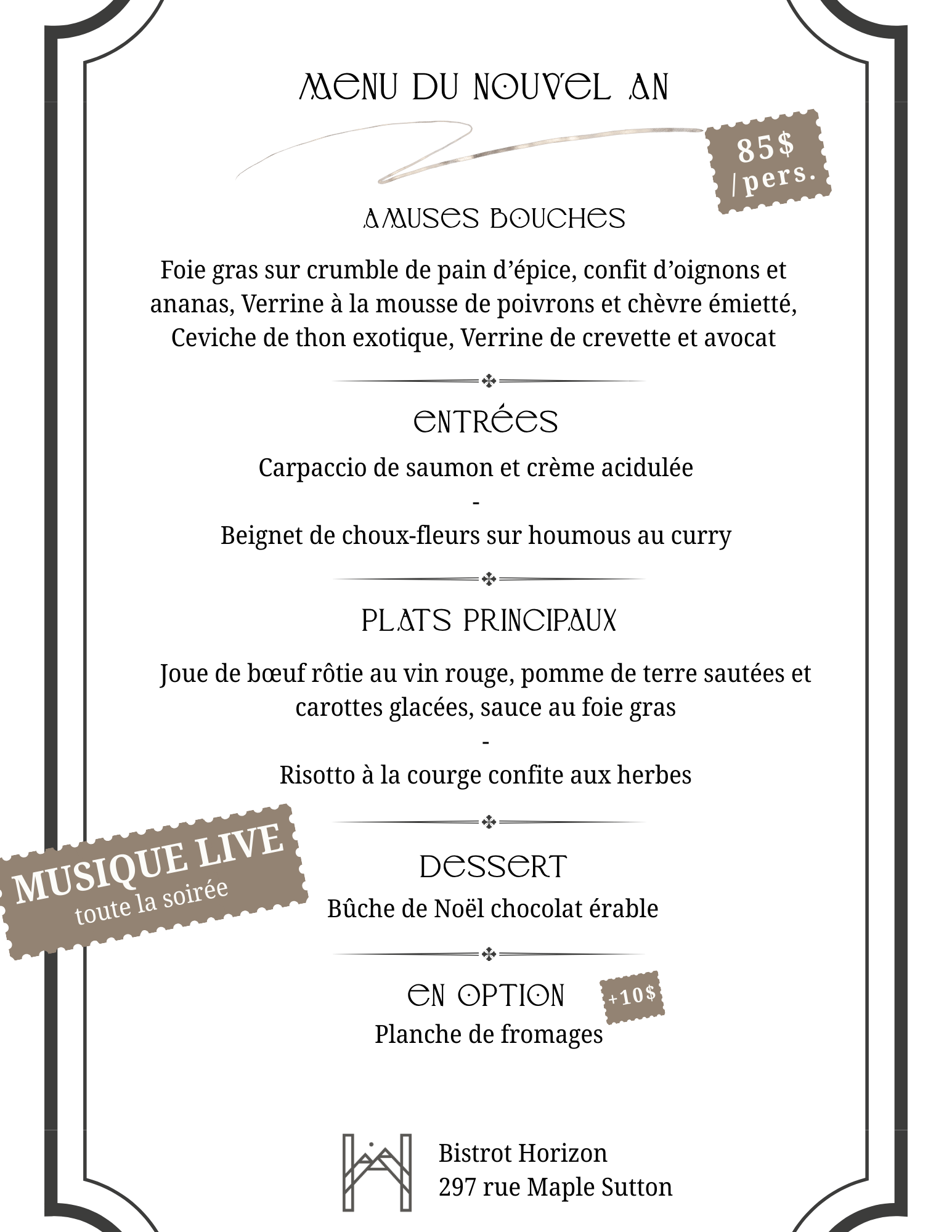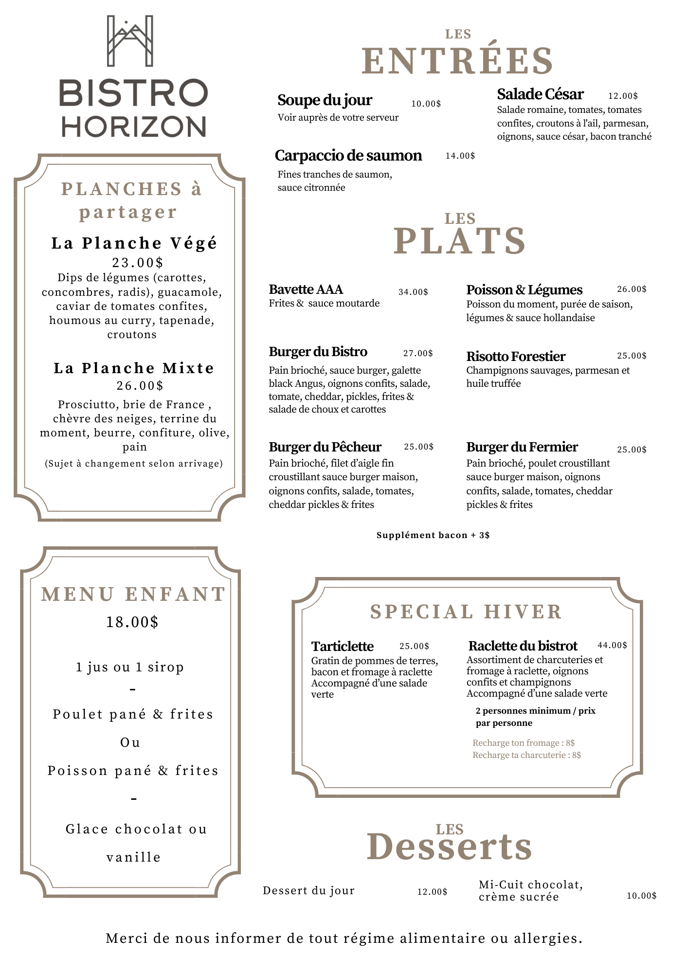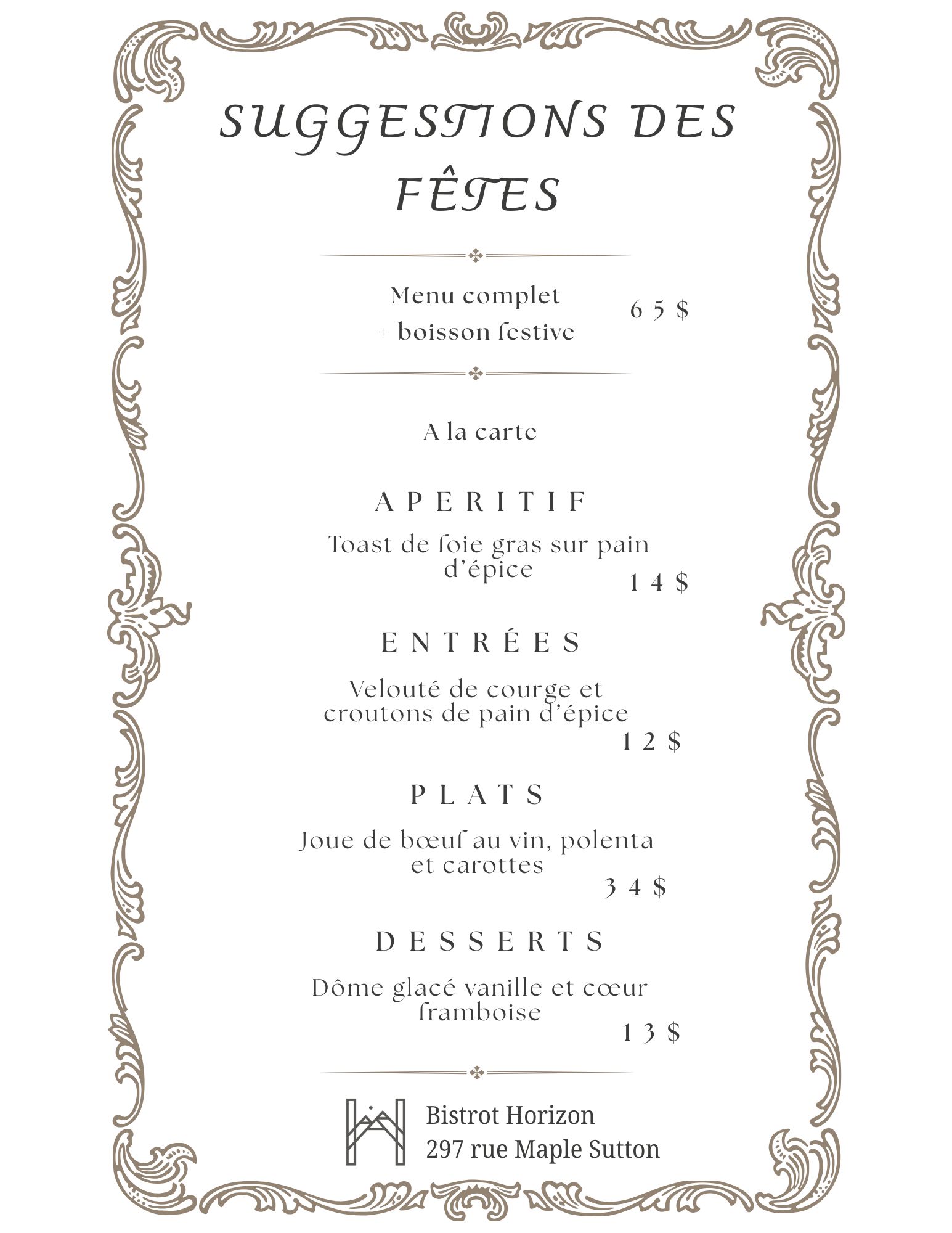 Découvrez notre menu de saison ainsi que nos menus pour le temps des fêtes et venez les célébrer en famille et entre amis au Bistro Horizon !